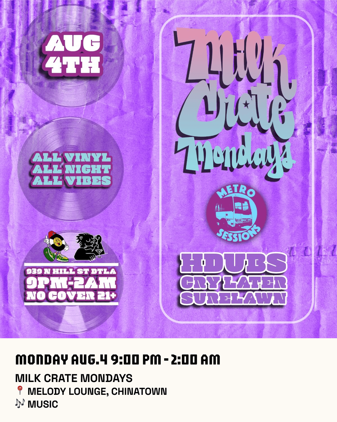 Kick off the week with Milk Crate Mondays at the iconic Melody Lounge! Featuring residents @dpsound_bridgescrew and guests @metrosessions, @hdubs__, @dj.cry.later, and @surelawn. Enjoy $10 Monday Mules (any well mules) and pop-up vinyl shop @phersone.